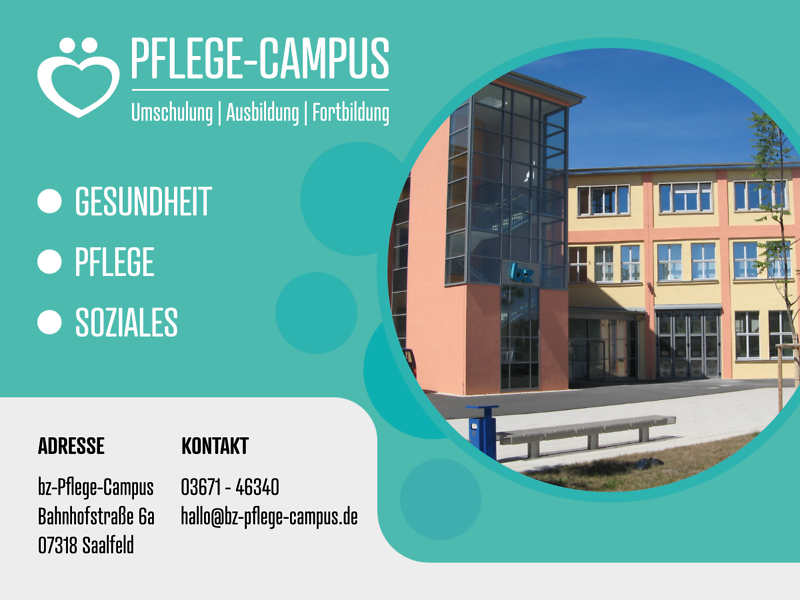 In unserem Gebäude in der Bahnhofstraße 6 a in Saalfeld erwartet Sie ab September ein neuer moderner Lernort für Umschulungen, Ausbildungen und Fortbildungen in den Bereichen Gesundheit, Pflege und Soziales.