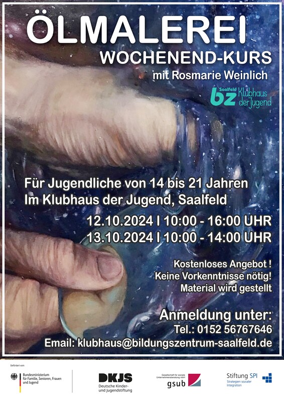 Am letzten Wochenende der Herbstferien findet im Klubhaus der Jugend ein Ölmalerei-Kurs für Jugendliche von 14 - 21 Jahren statt. Hierfür haben wir die Dipl. Künstlerin Rosmarie Weinlich mit an Bord geholt. Es wird viel ums ums Ausprobieren gehen und dabei ist es egal, ob die Teilnehmer:innen bereits erste Pinselstriche gewagt haben oder völlig neu in der Kunst sind. Sie wird Schritt für Schritt durch die Geheimnisse der Ölmalerei leiten und die Teilnehmer:innen dabei unterstützen, ihre eigenen Werke zu erschaffen — spannende Techniken, lebendige Farben und die Möglichkeit, Kreativität in vollen Zügen auszuleben.