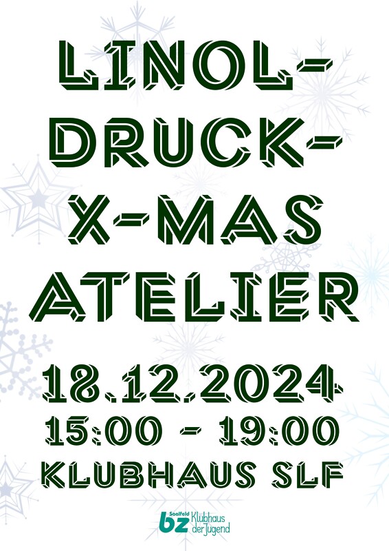 Am 18.12.2024 von 15:00 bis 19:00 Uhr verwandelt sich der Klubhaus Jugendbereich wieder in ein Atelier, bei dem die Technik des Linoldrucks im Fokus steht. Mit Kinderpunsch, Gebäck und in entspannter Atmosphäre können eigene Motive geschnitzt, gedruckt und/oder künstlerische Weihnachtskarten gebastelt werden. Teilnahme kostenlos.
