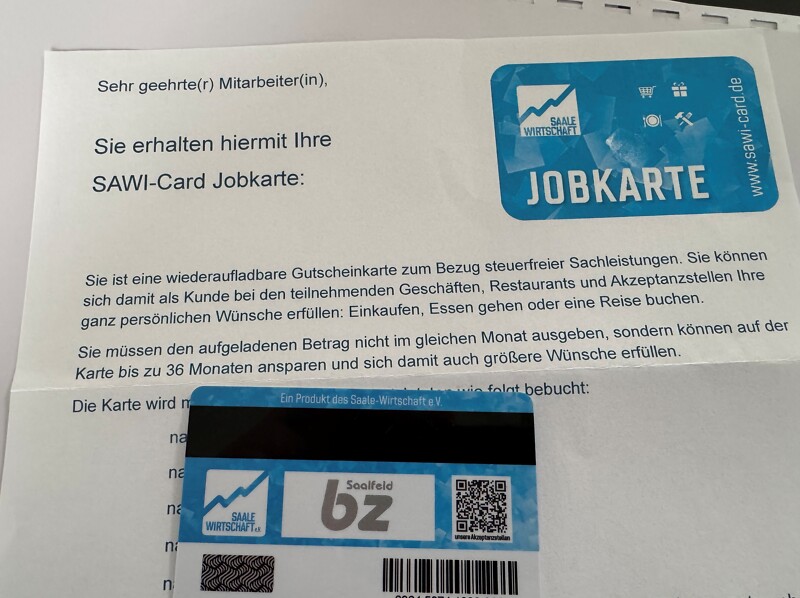Seit April 2025 erhalten die Mitarbeiterinnen und Mitarbeiter des Bildungszentrums Saalfeld die neue SAWI-Card Jobkarte. Die wiederaufladbare Gutscheinkarte ermöglicht es Arbeitgebern, steuerfreie Sachbezüge zur Verfügung zu stellen, die bei zahlreichen regionalen Partnern eingelöst werden können – zum Beispiel zum Einkaufen, für Restaurantbesuche oder zur Buchung von Reisen.