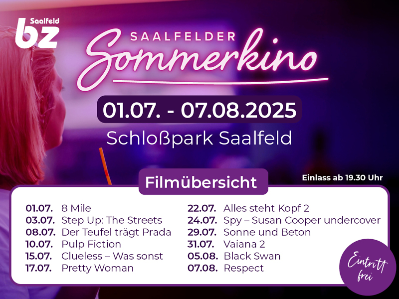 Vom 01. Juli bis 07. August 2025 verwandelt sich der Schlosspark Saalfeld wieder in einen stimmungsvollen Open-Air-Kinosaal. An insgesamt zwölf Sommerabenden wird ein abwechslungsreiches Filmprogramm unter freiem Himmel geboten – kostenfrei und für alle Besucherinnen und Besucher offen. Gezeigt werden Klassiker, Kultfilme, romantische Highlights sowie aktuelle Familien- und Animationsfilme. Alle Filmabende beginnen bei Einbruch der Dämmerung – eine einzigartige Atmosphäre ist garantiert.