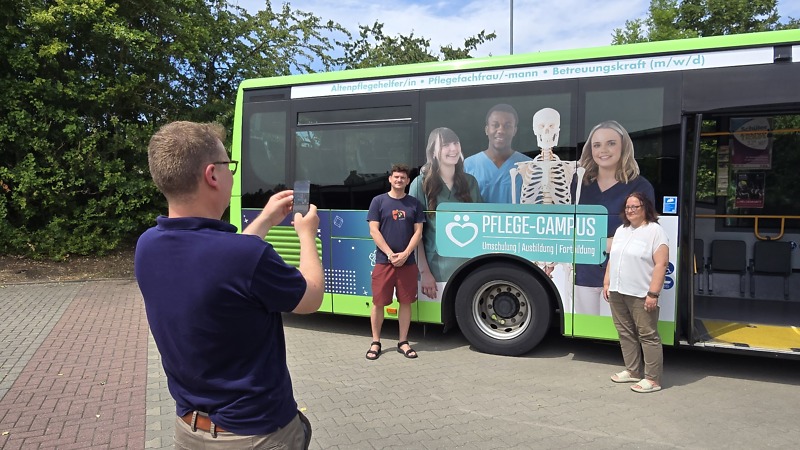 In der vergangenen Woche hatten wir die Gelegenheit, unseren frisch gestalteten bz-Bus erstmals in Augenschein zu nehmen. Ab sofort ist er im OVS-Gebiet, insbesondere im Stadtgebiet von Saalfeld und Rudolstadt, unterwegs – als rollender Botschafter für unsere vielfältigen Angebote in der Aus- und Weiterbildung, unsere Pflegeschule sowie unsere offenen Stellen im BZ Saalfeld.
