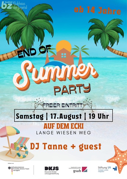 17.08.2024, ab 19:00 Uhr: Unter dem Motto „ECKI FÜR ALLE - vereint in Vielfalt und Fairplay“ findet die End of Summer Party“ auf dem Ecki statt...Von 19:00 bis 24:00 Uhr findet unter dem Motto „ECKI FÜR ALLE - vereint in Vielfalt und Fairplay“ die „End of Summer Party“ auf dem Ecki statt. Eine Open-Air-Disco von Jugendlichen für Jugendliche ab 14 Jahren. Der Eintritt ist frei!